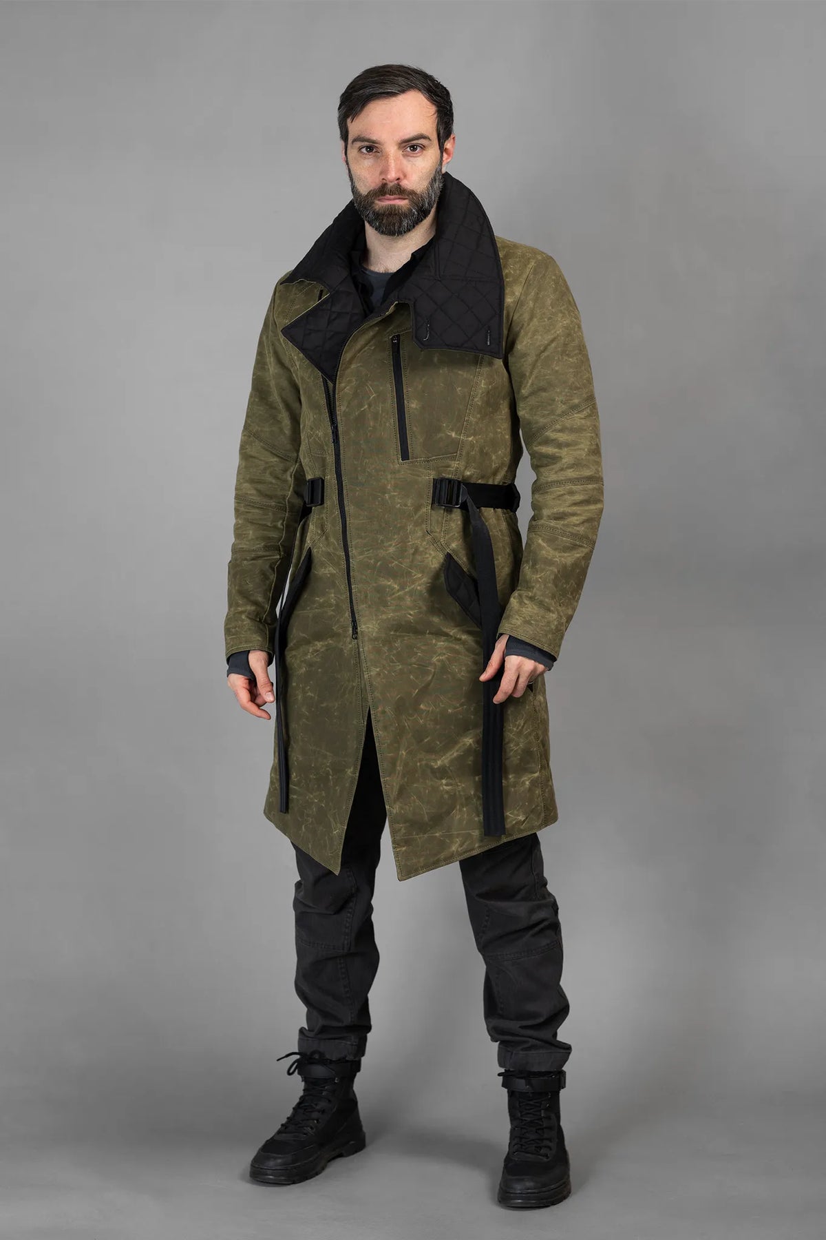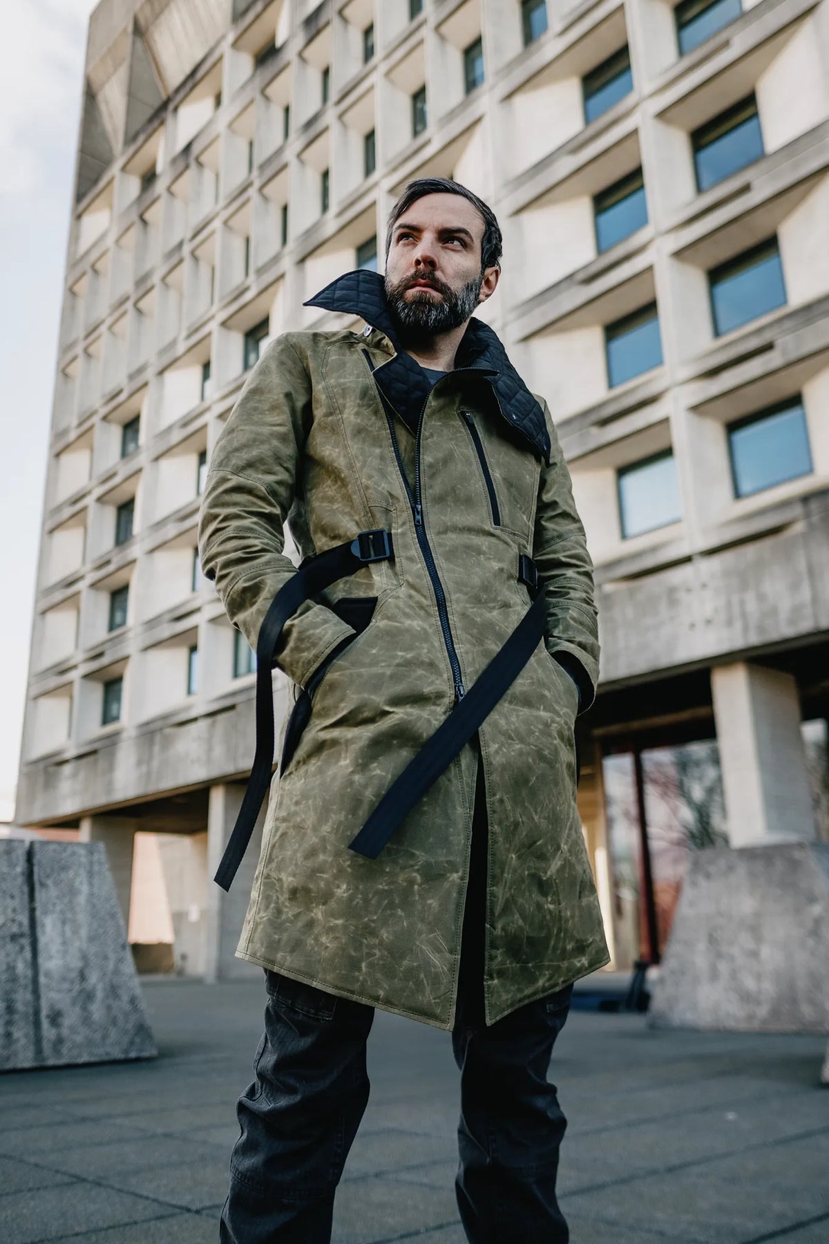 Designed for those who live on the edge, this waxed canvas jacket balances rugged durability with refined style, perfect for both the wilderness and the urban streets of a futuristic dream.
