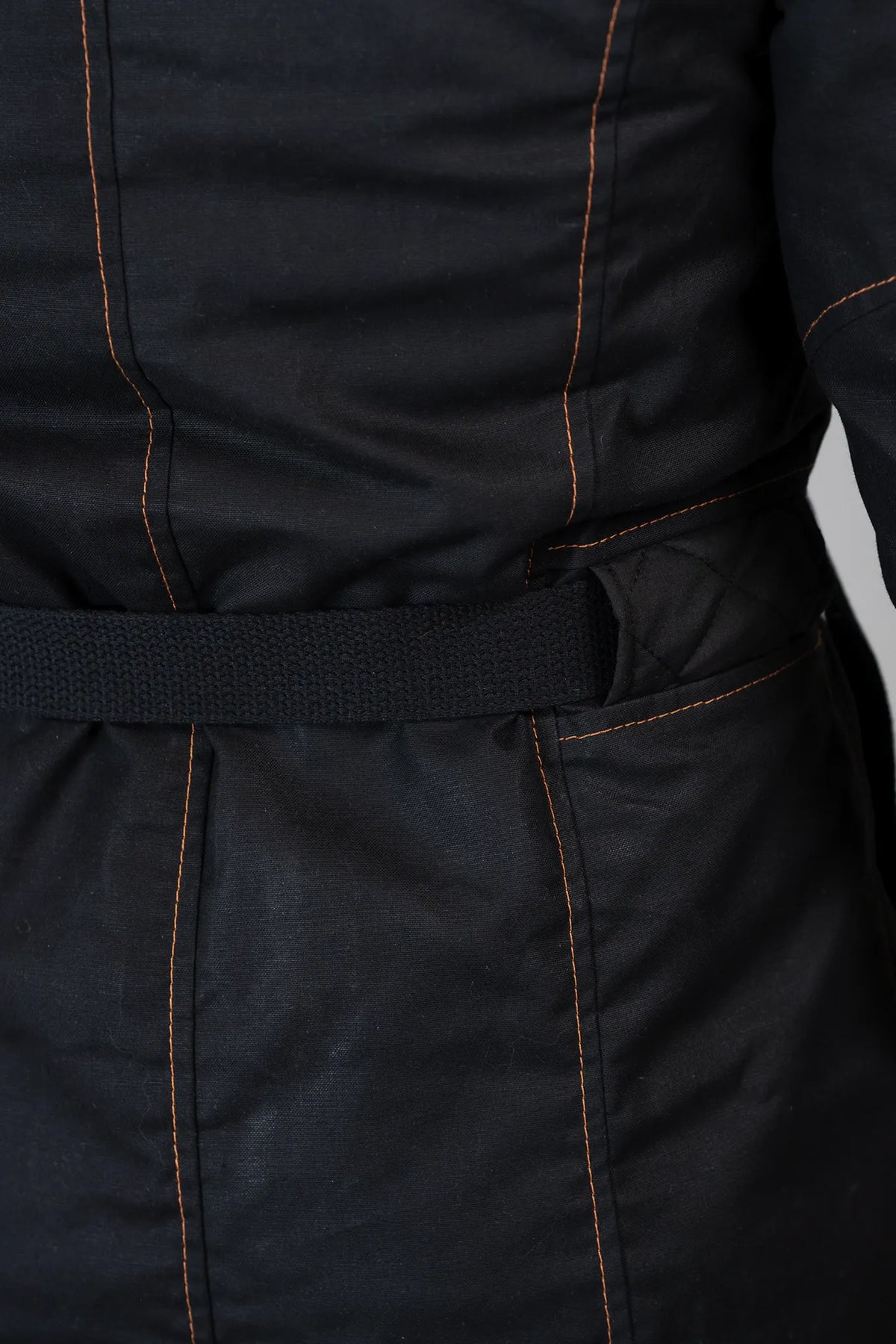 • Rusted Edge - Black waxed canvas with black quilted broadcloth, black lining, and rust-colored topstitching.