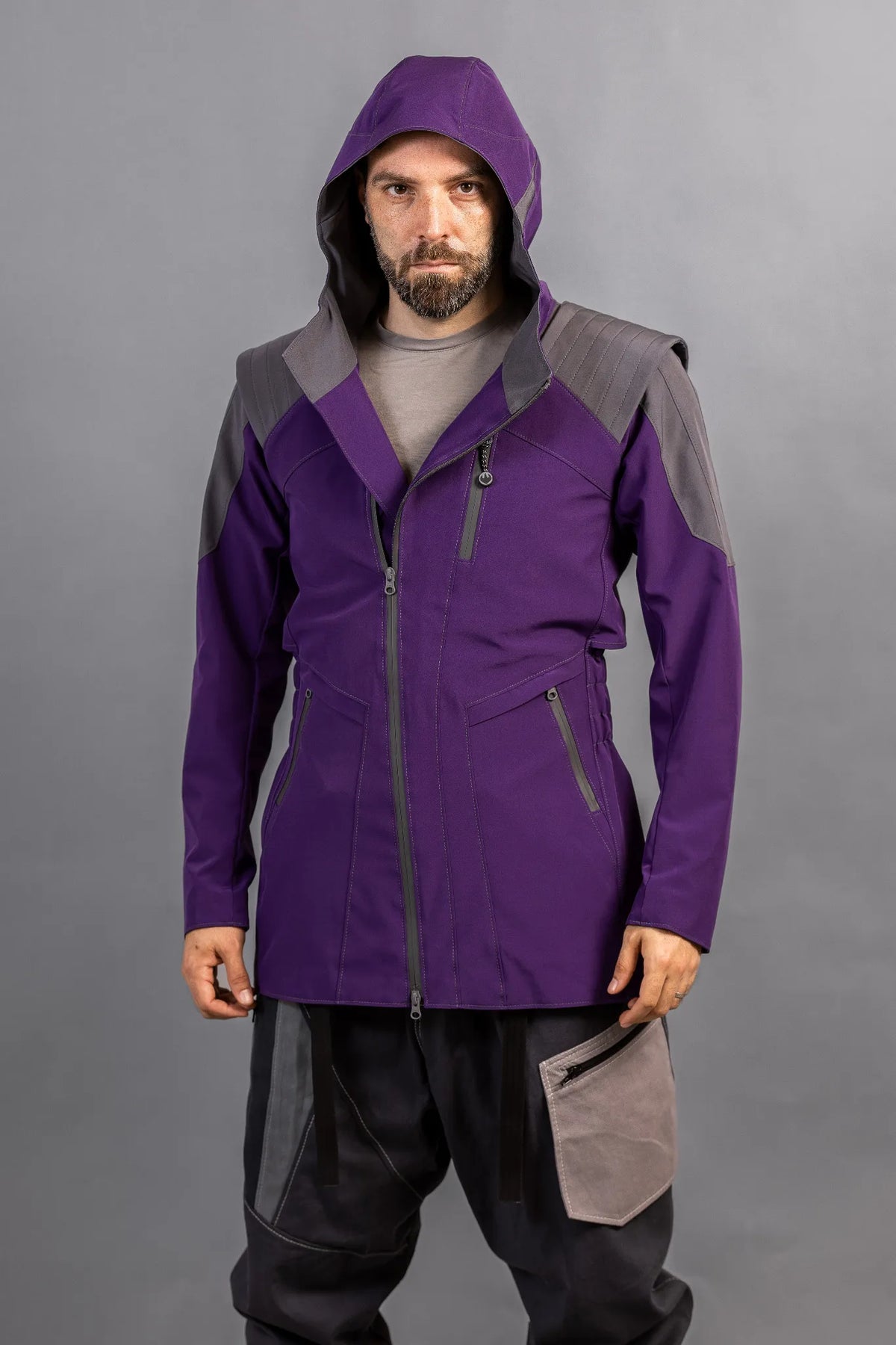- Oroku Saki - Purple with grey accents and grey liner, grey topstitching, and grey waterproof zippers and custom zipper pull
