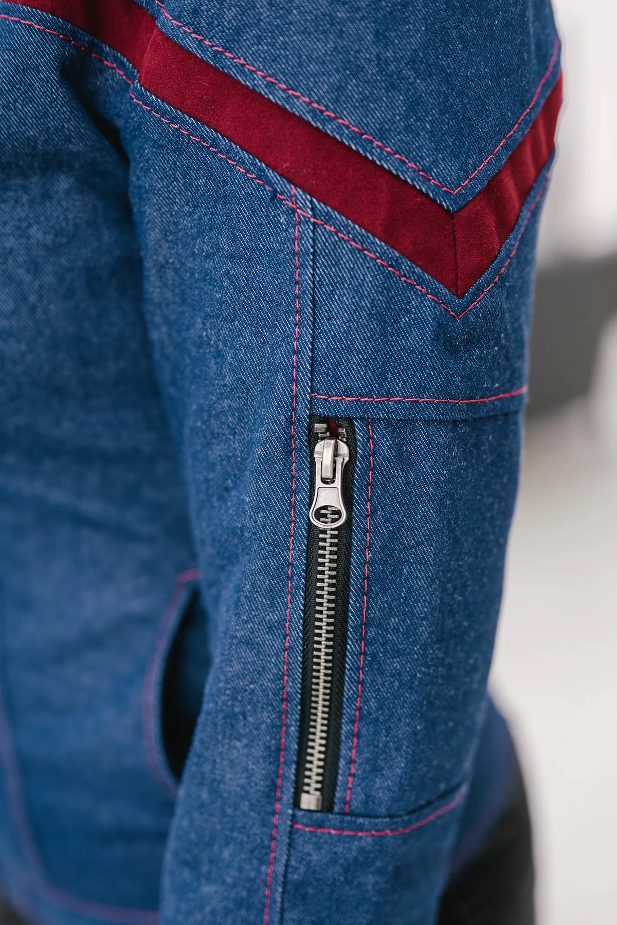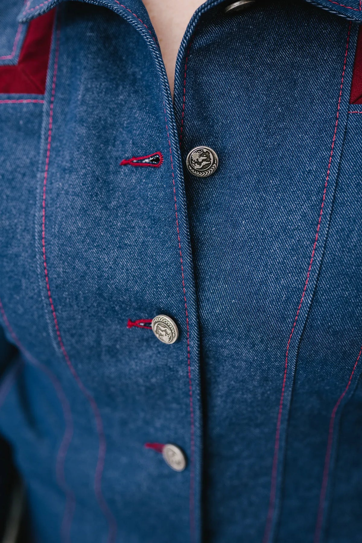 - Operations Red - Blue denim with red accents, red topstitching, and antique nickel buttons and zipper