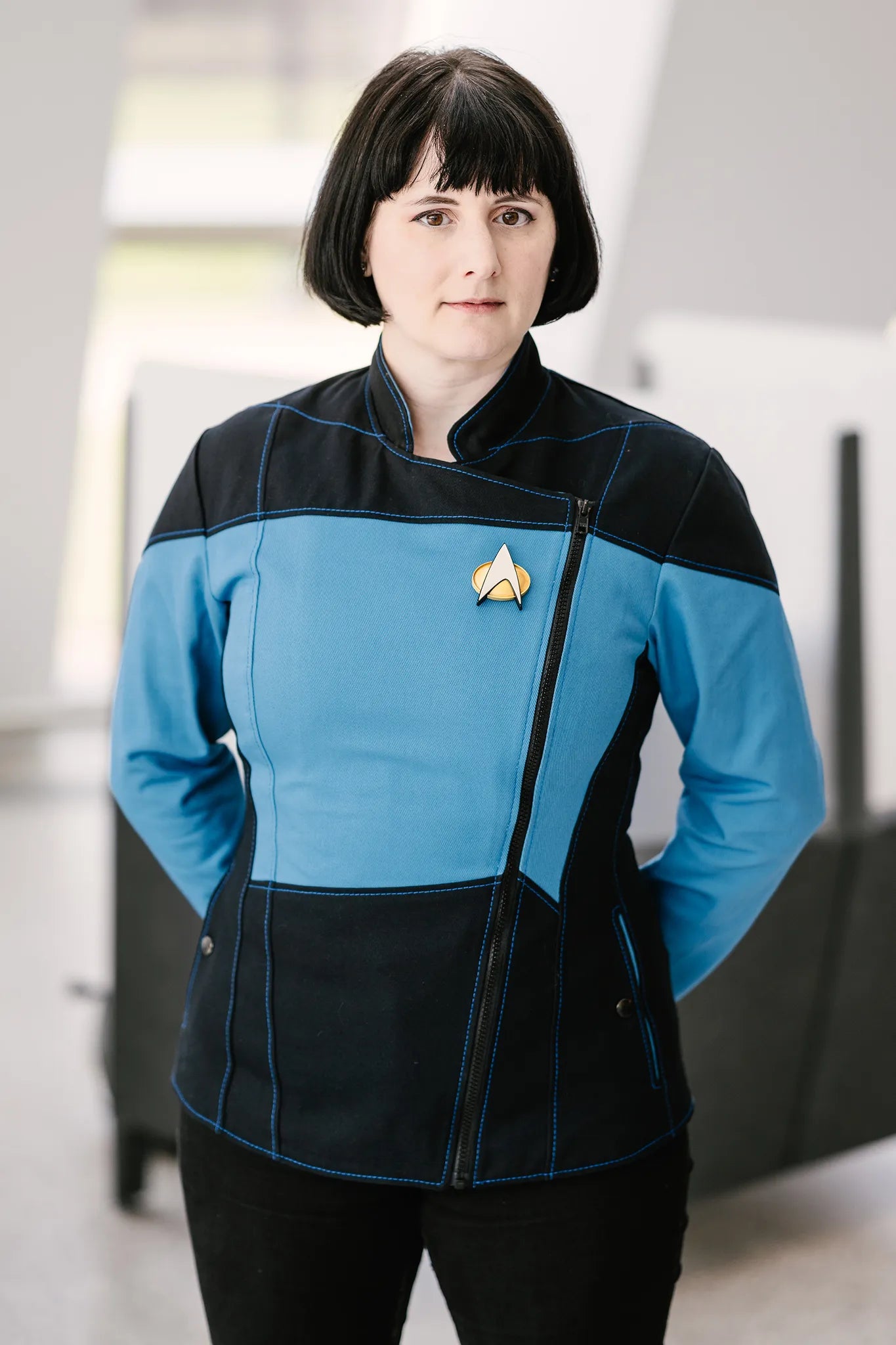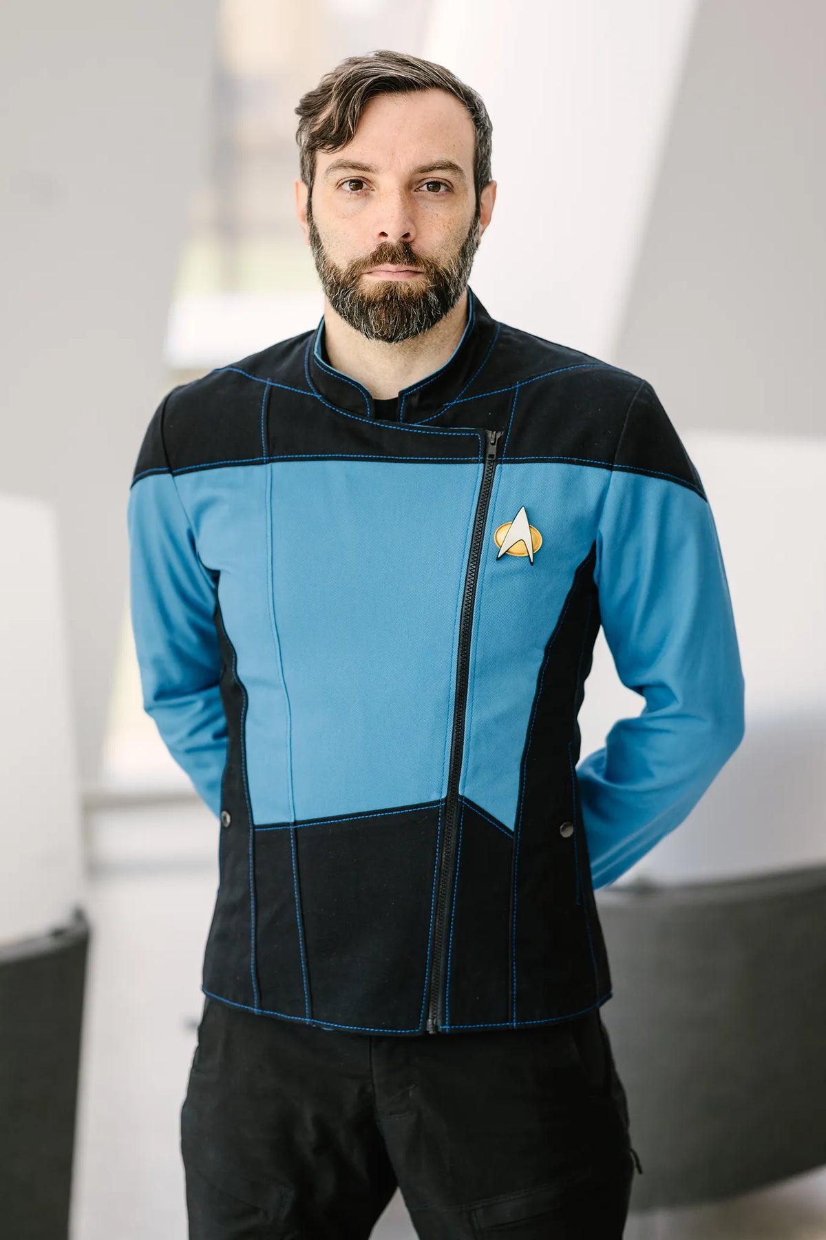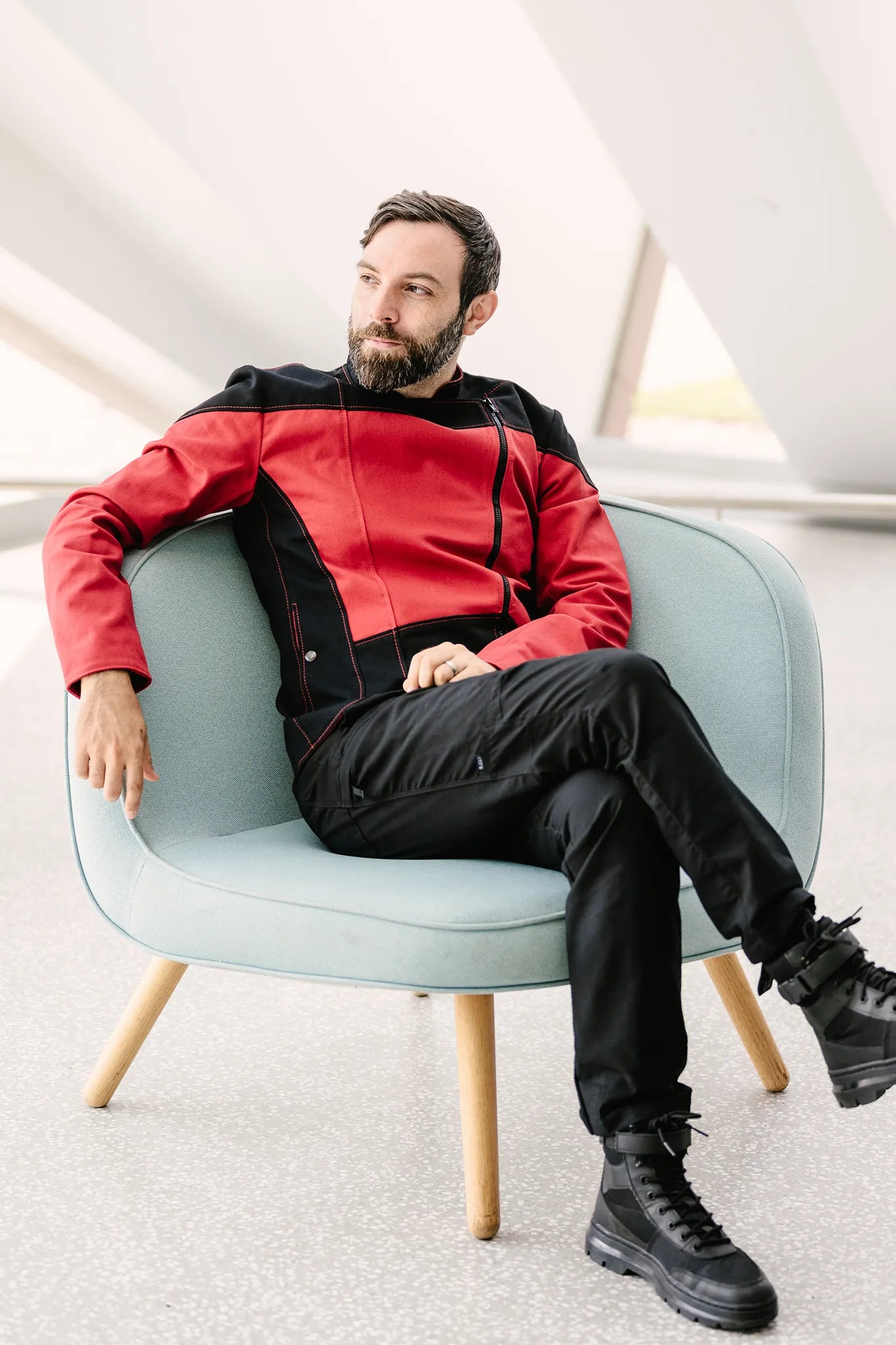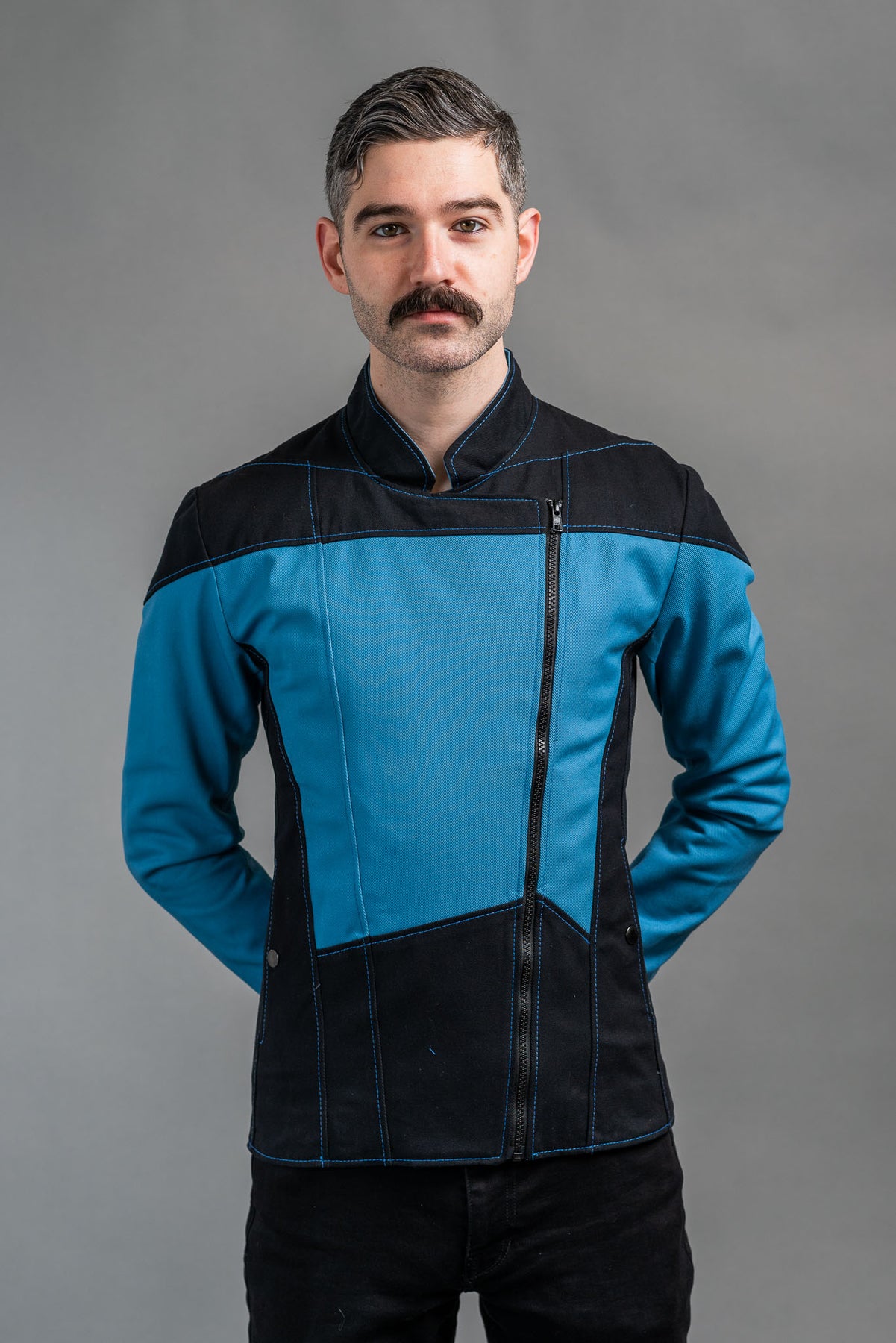 The signature angular style of the Star Trek: The Next Generation uniforms are transformed into streetwear: recognizable as TNG-inspired, practical, and wearable.