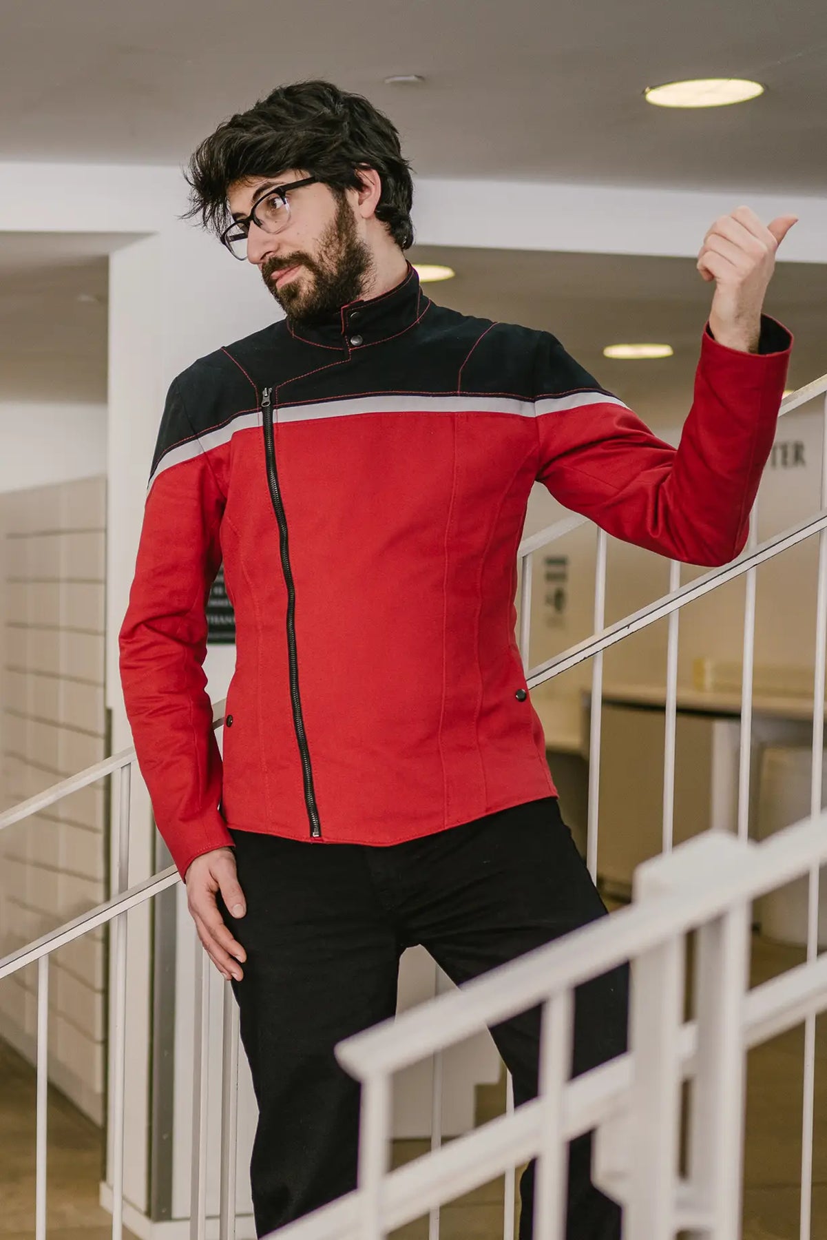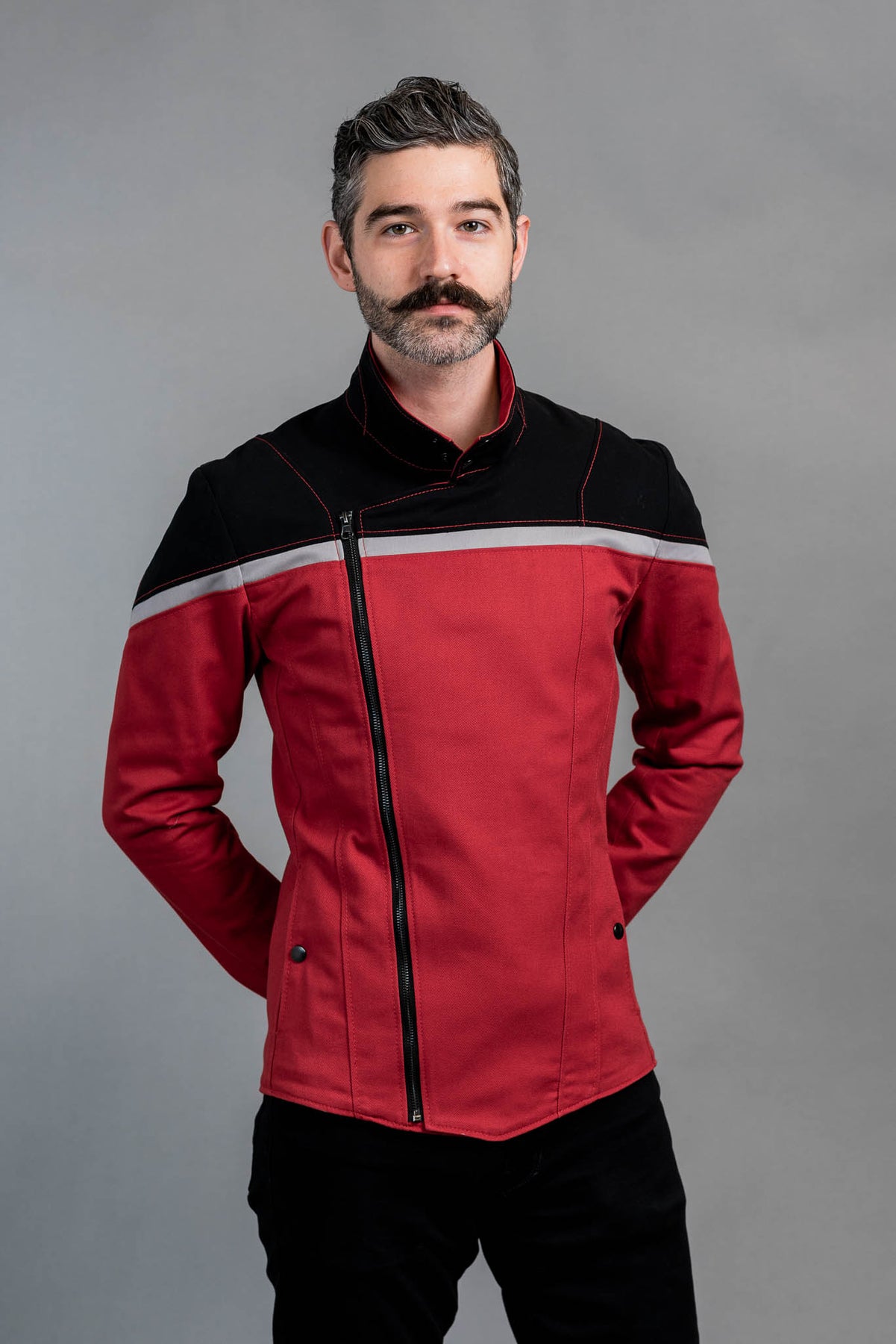 The semi-moto zip front closure and dual snap collar looks perfect on the (Lower) decks of the USS Cerritos or out with friends.