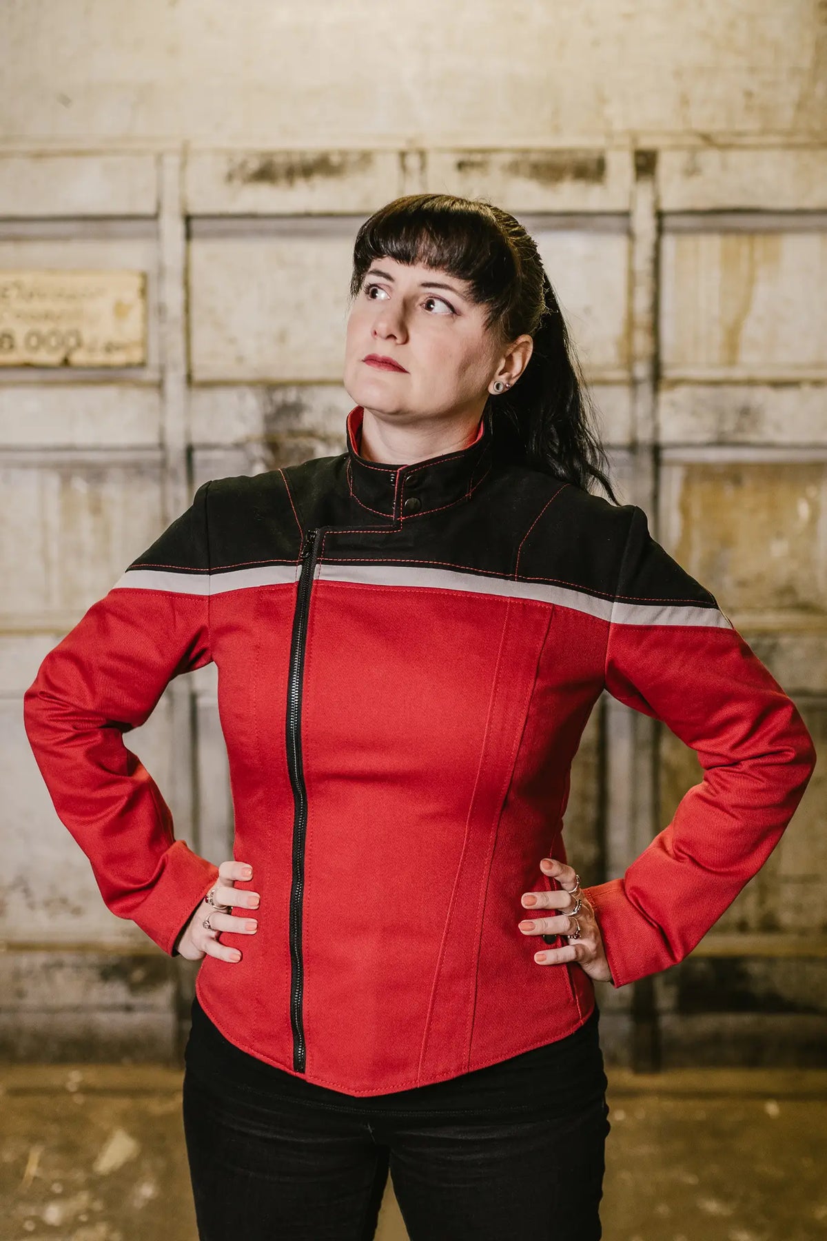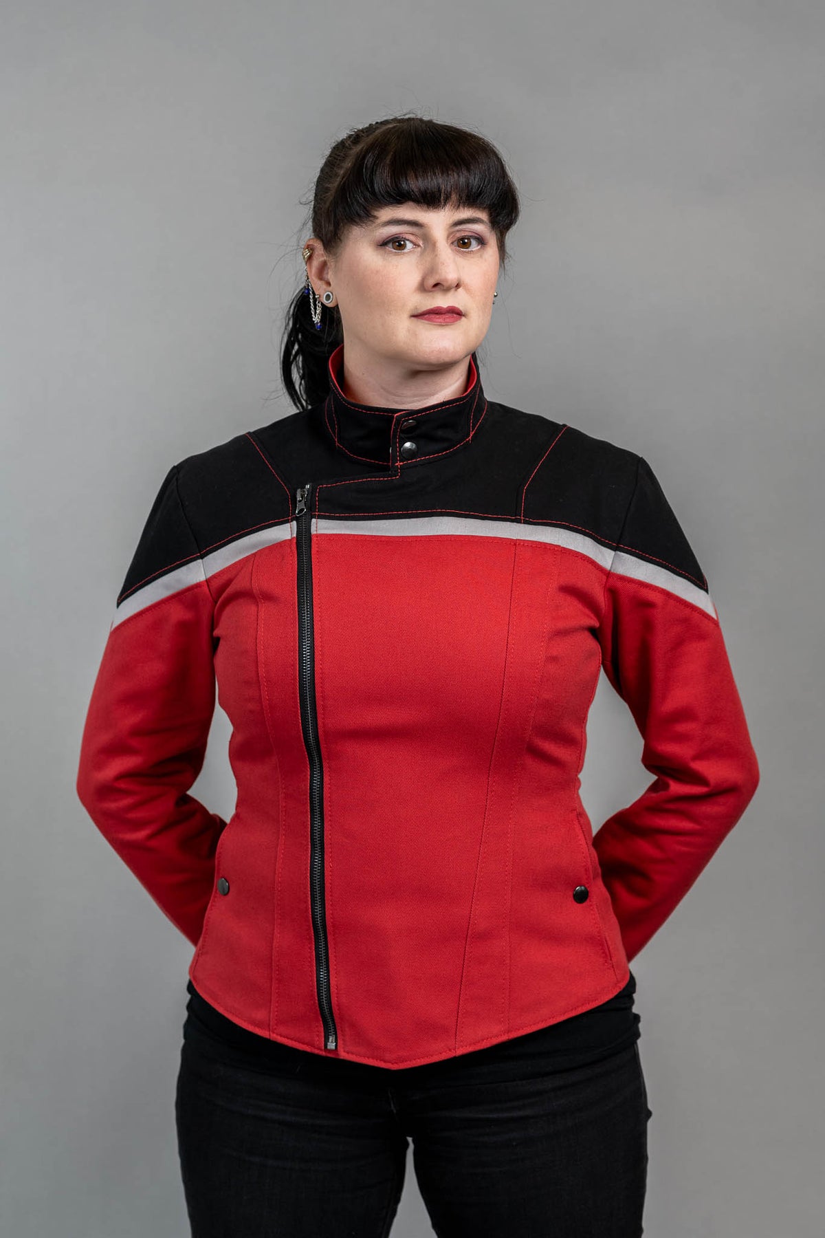 The semi-moto zip front closure and dual snap collar looks perfect on the (Lower) decks of the USS Cerritos or out with friends.