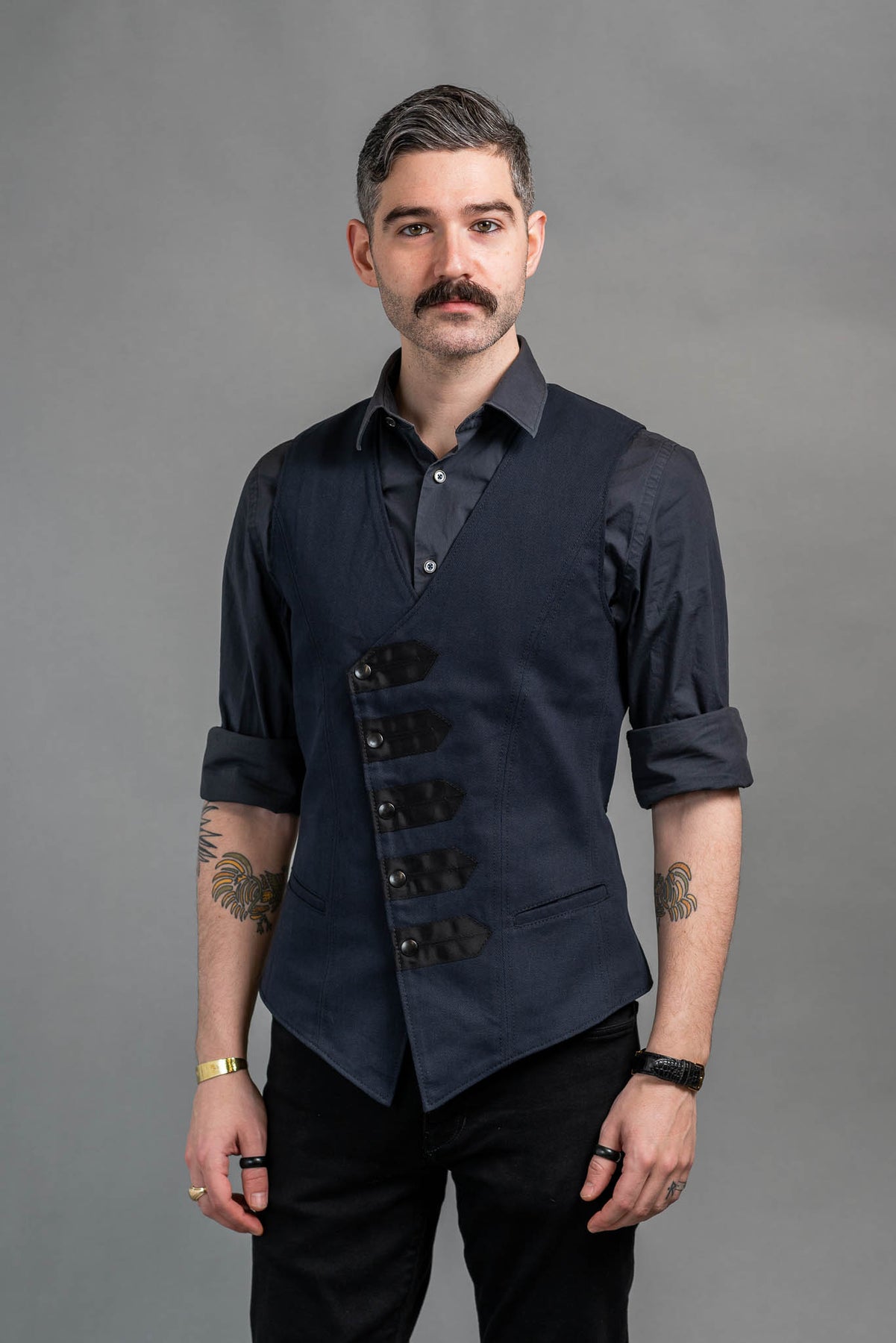 The Harker Vest blends the distinguished finery of a classic Victorian vest with a rakish angular slice that is signature Volante.