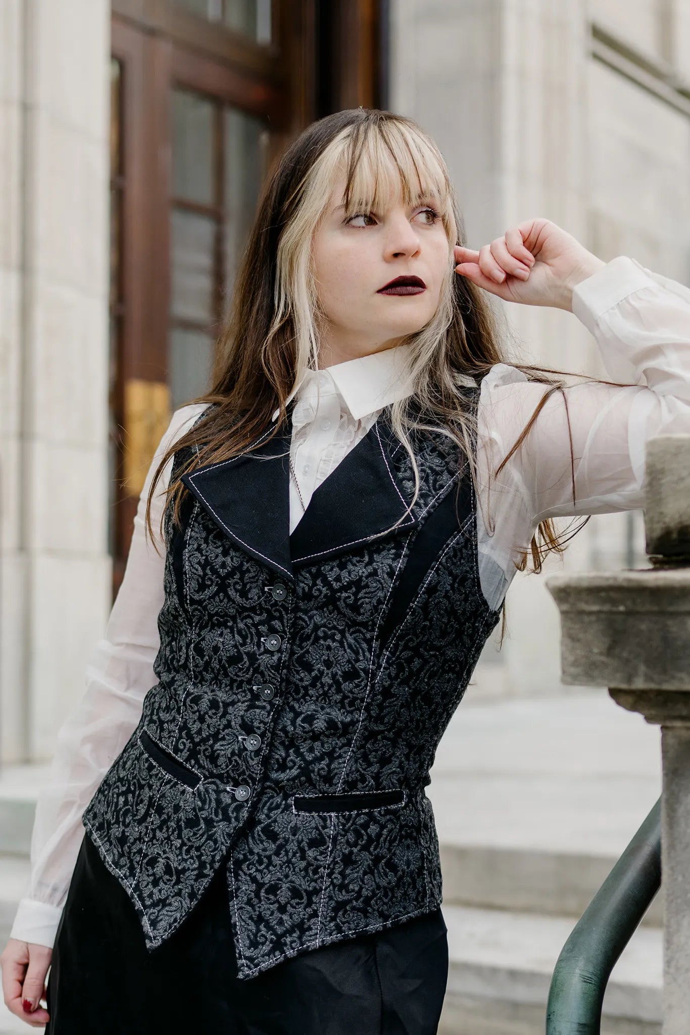 A unique, jacquard-pattern satin fabric makes up the shell of the vest, with a sturdy, brushed cotton used for the black accents.